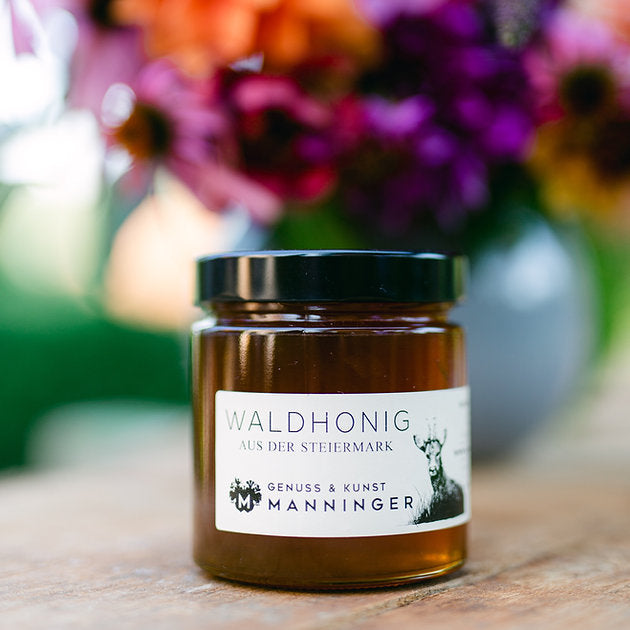 So schmackt die Steiermark: Der von Bienen gesammelte Honigtau von Laub- und Nadelbäumen gibt dem bernsteinfarbenen Waldhonig von Genuss & Kunst Manninger sein Aroma. Der Honig spendet natürliche Süße und ist zugleich reich an Mineralstoffen. Bienen und Bäume bilden im Obstgarten unserer Gastgeber eine fruchtbares Ökosystem. Bekannt sind sie außerdem für ihren Essig und das hausgemachte Kernöl.