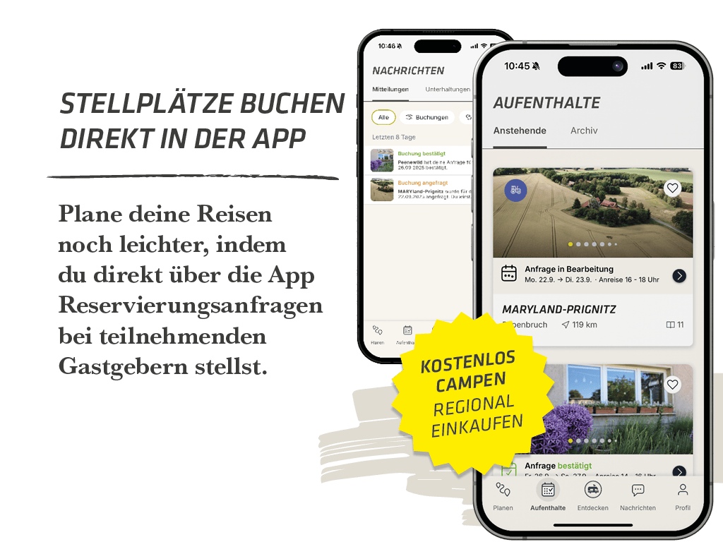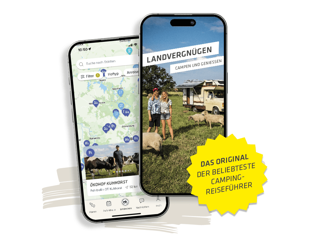 mit Reisemobil, Campingbus, Wohnwagen und Dachzelt. Sei willkommen bei Braumeistern, Imkern, Käsern und Winzern und übernachte direkt neben Alpakas, Wasserbüffeln, Schottischen Hochland-Rindern, Thüringer Waldziegen oder Lachsforellen.