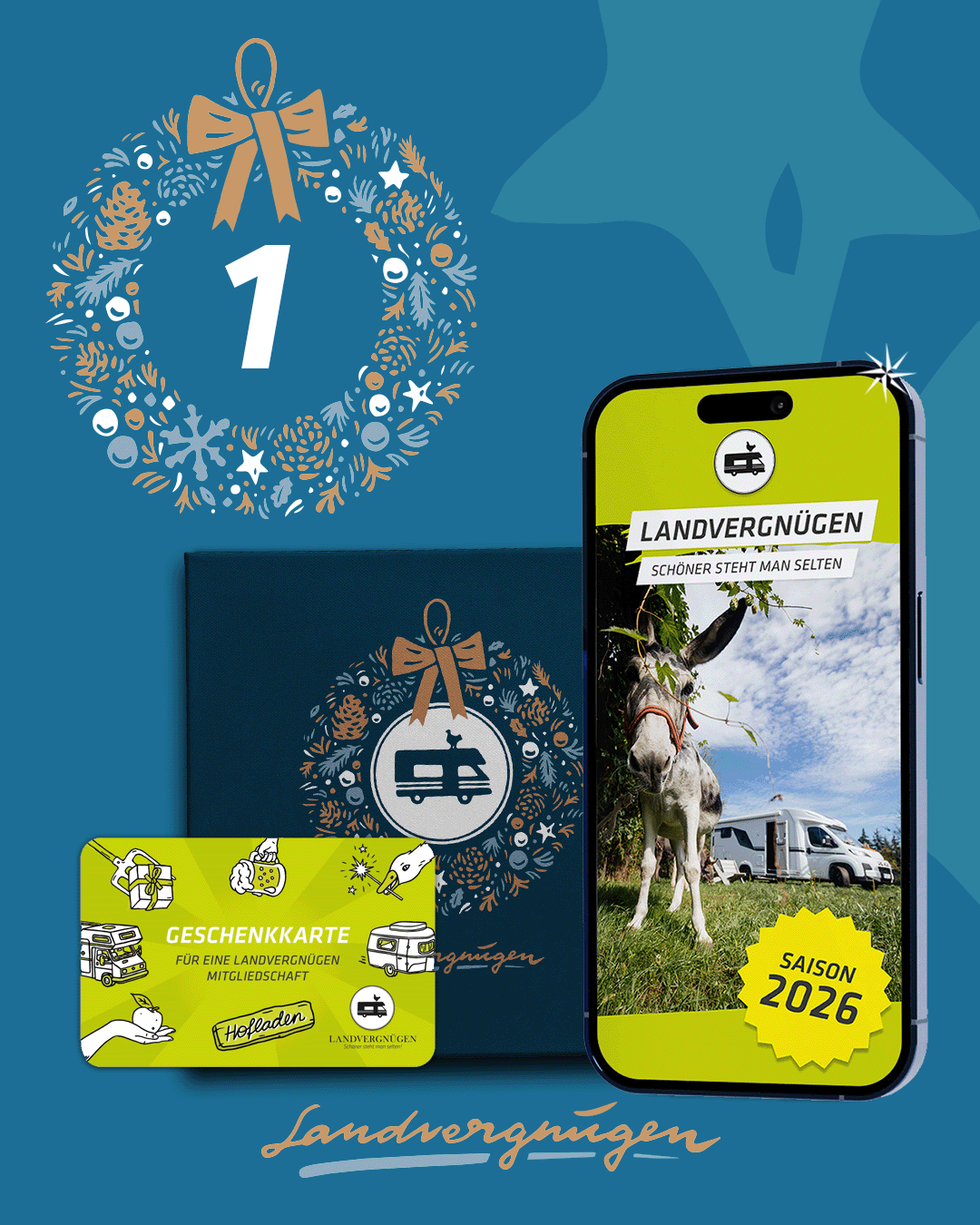 Landvergnügen und sonst nichts: Mit unserer Geschenkkarte liegst du immer richtig. Denn sie sichert dir oder einem lieben Menschen ein ganzes Jahr lang den Besuch naturnaher Stellplätze bei mehr als 2.100 Gastgebern in Deutschland, Österreich und der Schweiz. Wir verschicken sie in einer hochwertig folierte Weihnachtsverpackung, die am Heiligabend für leuchtende Augen sorgt.
