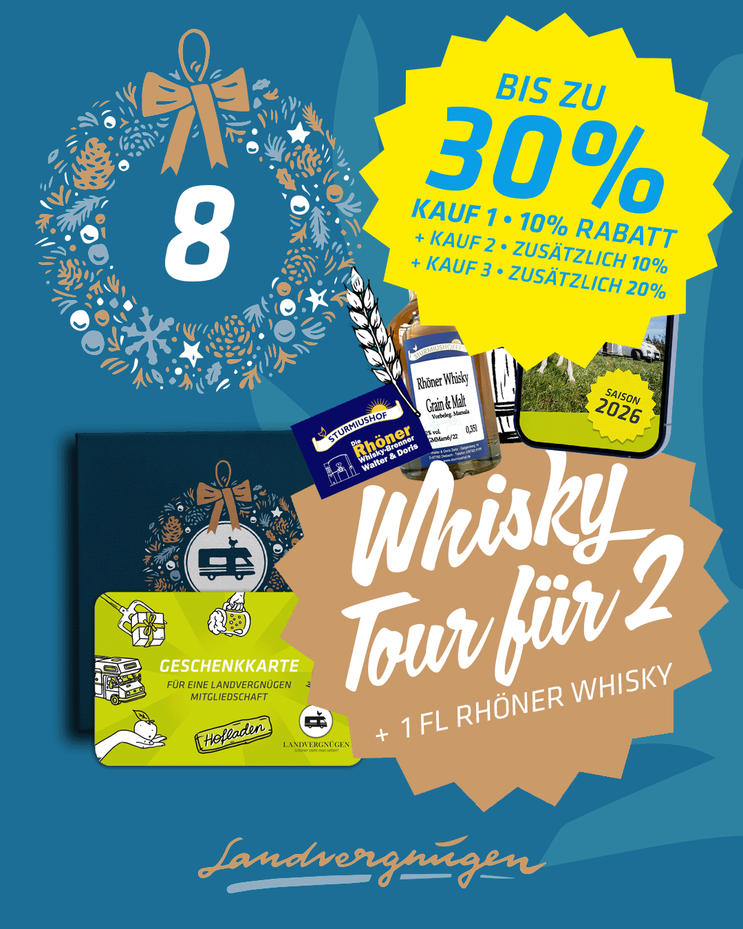 Was wäre Landvergnügen ohne Gastgeber wie Walter Zeitz? Auf seinem Sturmiushof in der Rhön empfängt er seit Jahren begeisterte Reisende. Sie genießen nicht nur den Ausblick vom wunderschönen Stellplatz aus, sondern auch seine Gastfreundschaft. Denn mit Wissen und Humor bringt er ihnen das Brennerhandwerk näher. Seine Spezialität ist der vielfach ausgezeichnete Rhöner Whisky. Verschenke eine Whiskytour für zwei mit Walter und lass dir alles über Herstellung und Lagerung erklären.